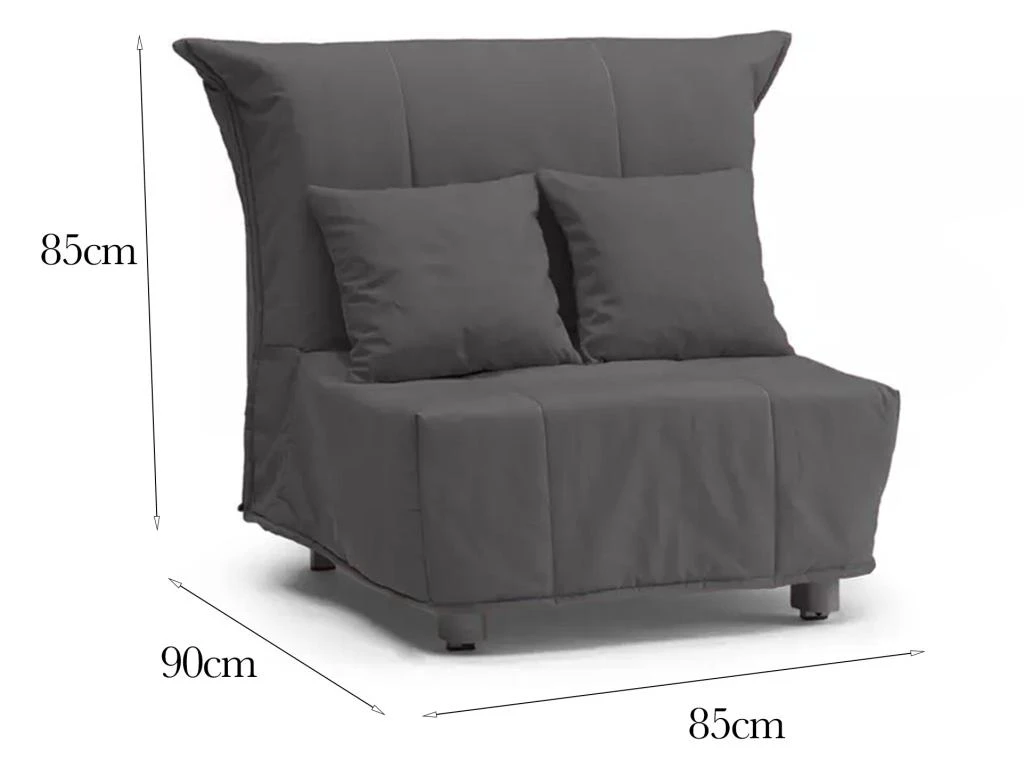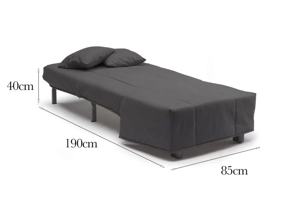 DIMENSIONS DU PRODUIT – Dimensions du canapé: Longueur 85 cm x Largeur 90 cm x Hauteur 85 cm – Dimensions du lit: Largeur 85 cm x Longueur 190 cm x Hauteur 40 cm environ – Hauteur d’assise 40 cm – Charge maximale: 200 kg