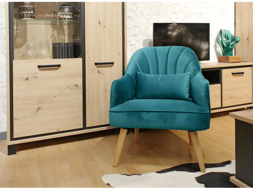 Un fauteuil au style vintage, fruit d’un élégant mariage entre le fauteuil marquise et le modèle coquillage. On aime sa forme généreuse et ses angles arrondis qui vous apporteront un réel confort. Ses 4 pieds en bois inclinés confèrent robustesse et stabilité à l’ensemble. Revêtu d’un élégant tissu velours bleu canard surmonté de jolies surpiqures, pour un effet matelassé, ce fauteuil offrira à votre intérieur un esprit doux et coloré. Existe en bleu foncé.