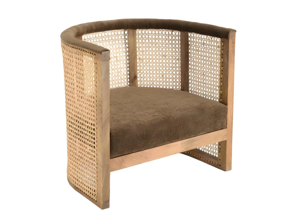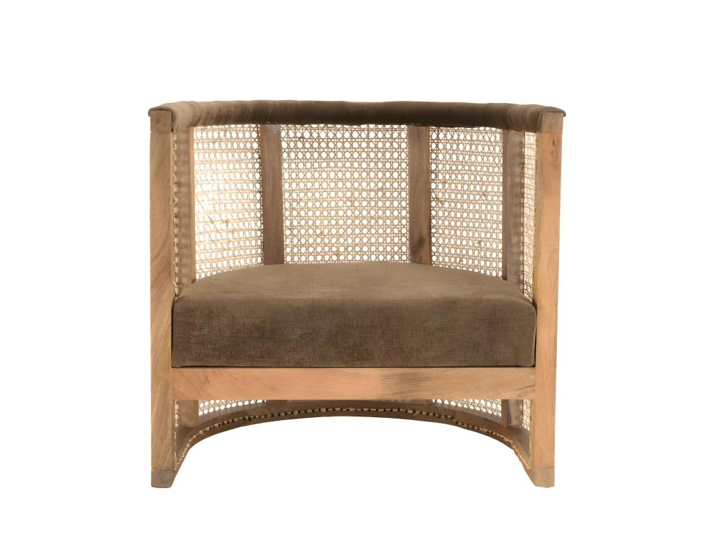 Fauteuil en manguier dossier cannage naturel assise couleur taupe. Dimensions : 75 x 60 x 70 cm. Article en Manguier/Rotin/Tissu polyester/Mousse polyuréthane.